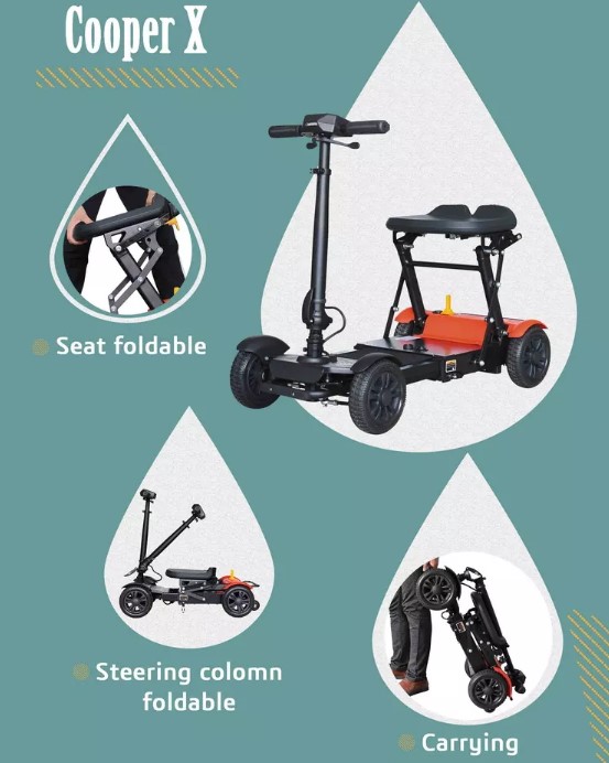 The seat is foldable with steering colomn and carrying. Adjustable frame and switch drive - Manual Lithium battery and Backrest optional. Scooter foldable, frame forward-backward adjusting, height adjustable of steering column. The actual endurance mileage after the battery is fully charged will decrease with theservice life, which is a normal loss.
